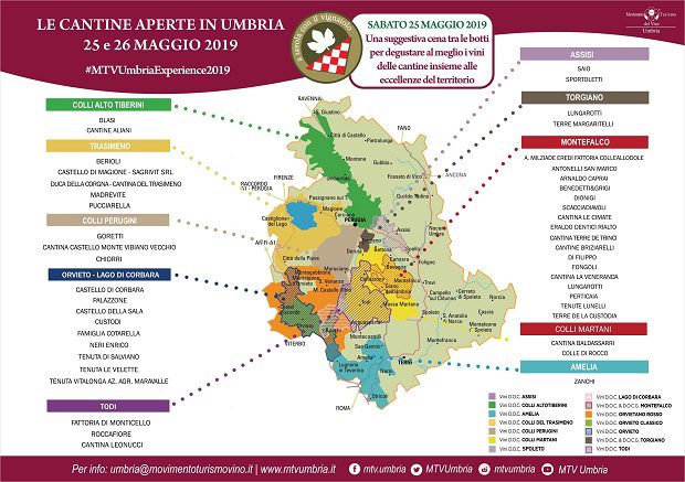 Da Montefalco al Lago Trasimeno, da Terni a Perugia, dall’Alto Tevere ad Orvieto, da Spoleto a Torgiano passando per Todi, Assisi e i Colli Martani, “Cantine Aperte” è una splendida occasione per riscoprire la ricchezza della regione a diretto contatto con le realtà produttive del territorio.