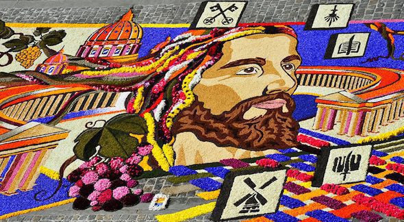 The species of flowers used for the “Infiorate” are numerous: cornflower, rose, carnation, poppy, fennel, iris, broom, elder, daisy, dandelion, thistle, sage, marigold, anemone, magnolia , turnip, sweet acacia, fig, oak, walnut, cypress, pine, wild orchid…