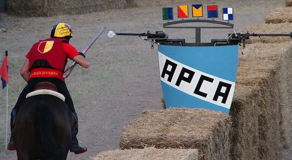 Il momento più spettacolare consiste proprio nell’appassionata sfida tra le contrade della città. Indossando i tradizionali costumi medievali, i cavalieri si sfidano, due alla volta, in una sfrenata corsa a cavallo: lancia in resta, devono colpire un bersaglio posto al termine del tragitto. I balestrieri, a loro volta, scagliano una freccia verso un bersaglio collegato ad una colombaia che, in caso di centro, si apre liberando un colombo.